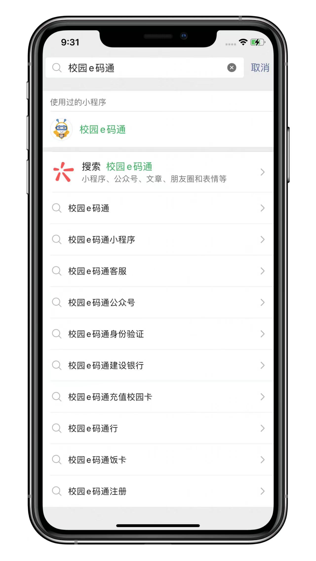2.在【微信】APP中搜索名为“校园e码通”的小程序